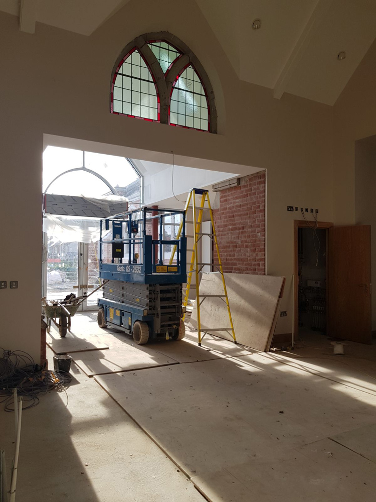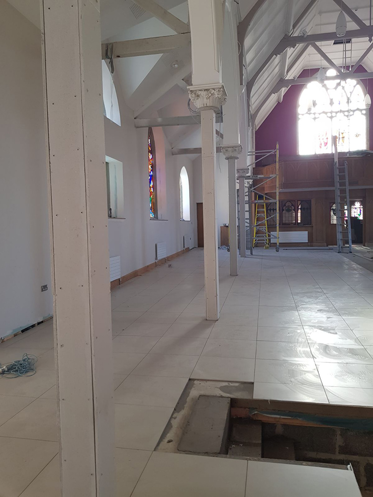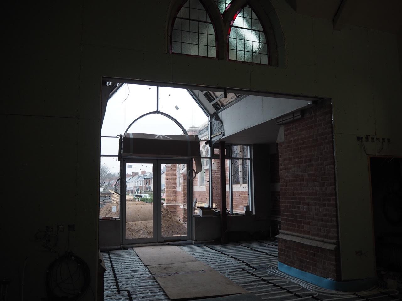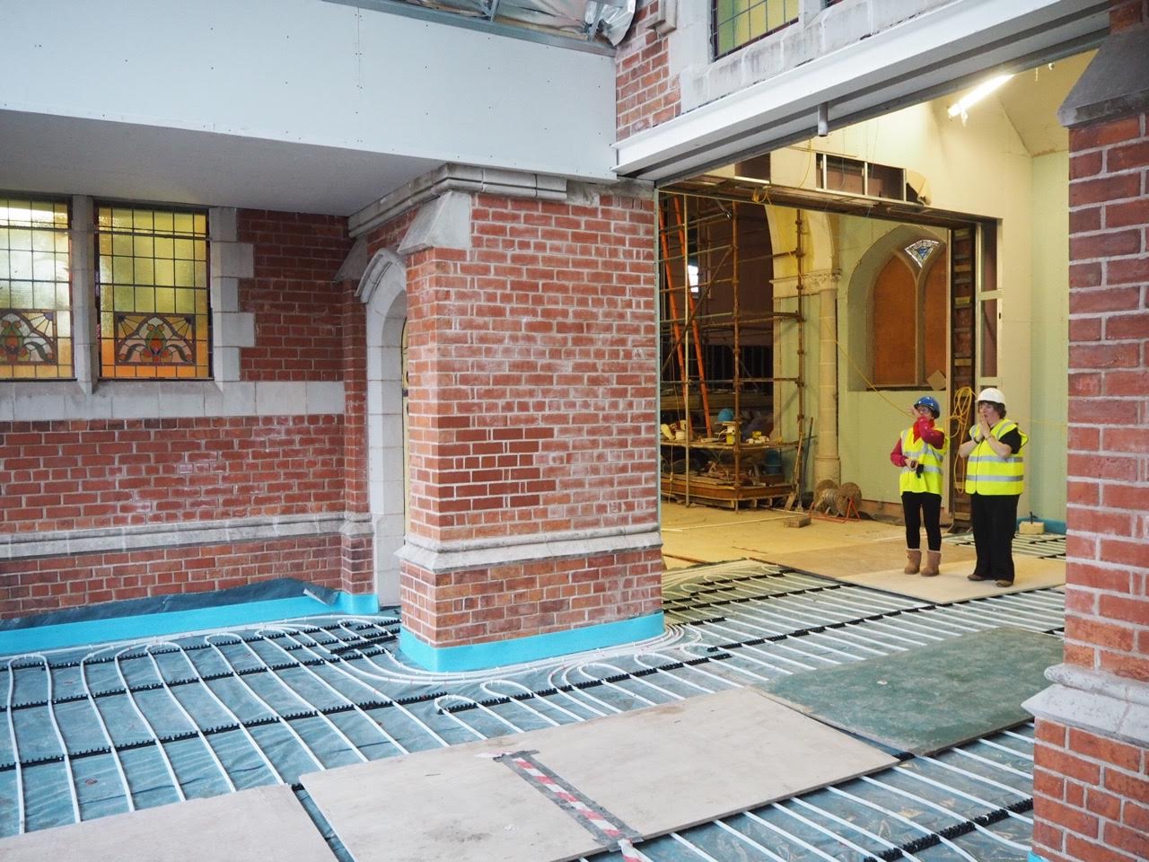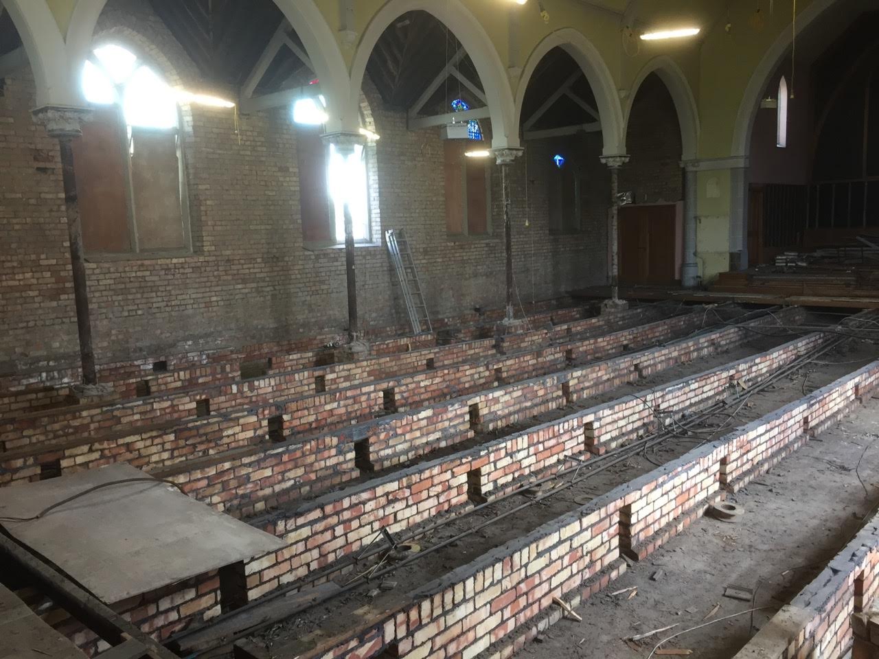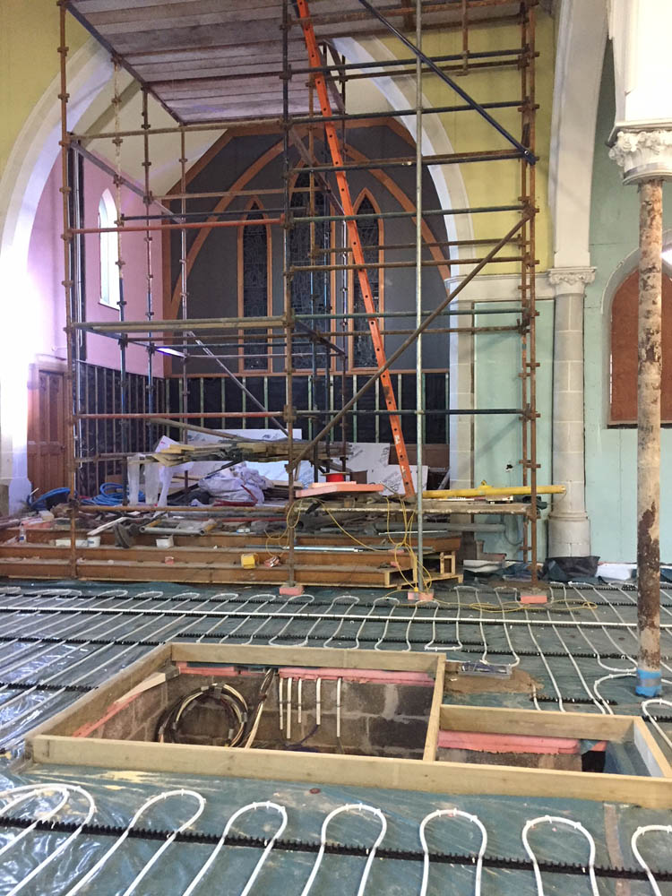 Work on the church building interior is going well. Now that the building has been sealed with the window glass in place in the Welcome Centre and the stained glass windows have been re-installed, including the Millennial Centennial Window, the builders have been able to install the underfloor heating, radiators and electric conduit. The scaffolding is now down to reveal the stunning brickwork. All very exciting now that we can see the end in sight!