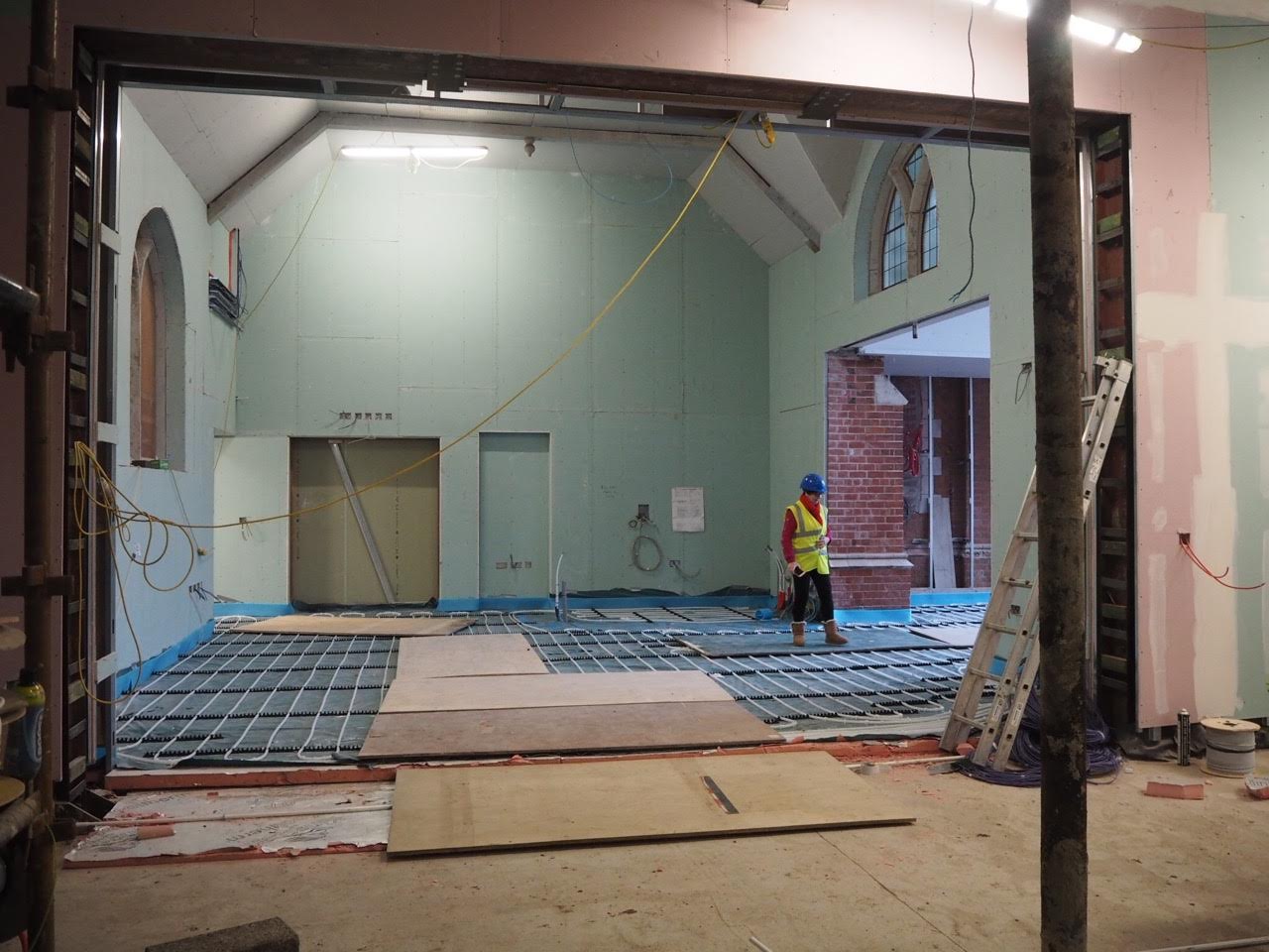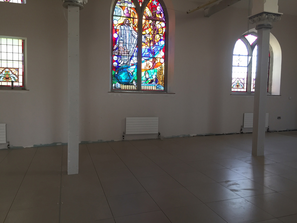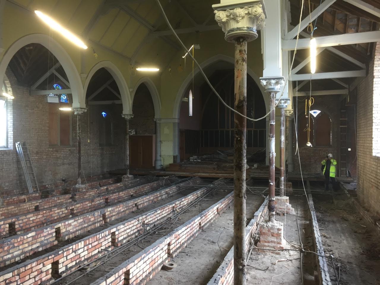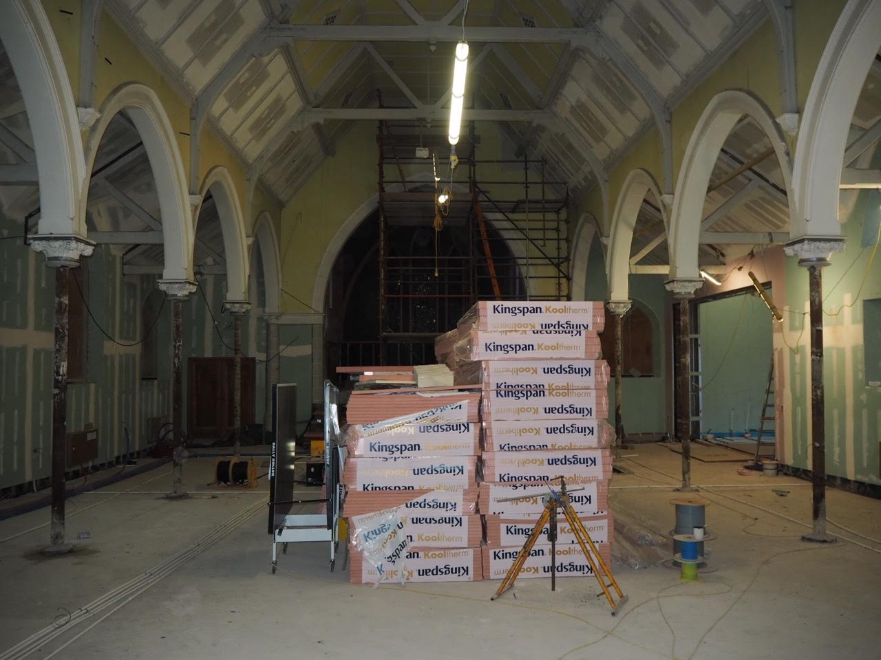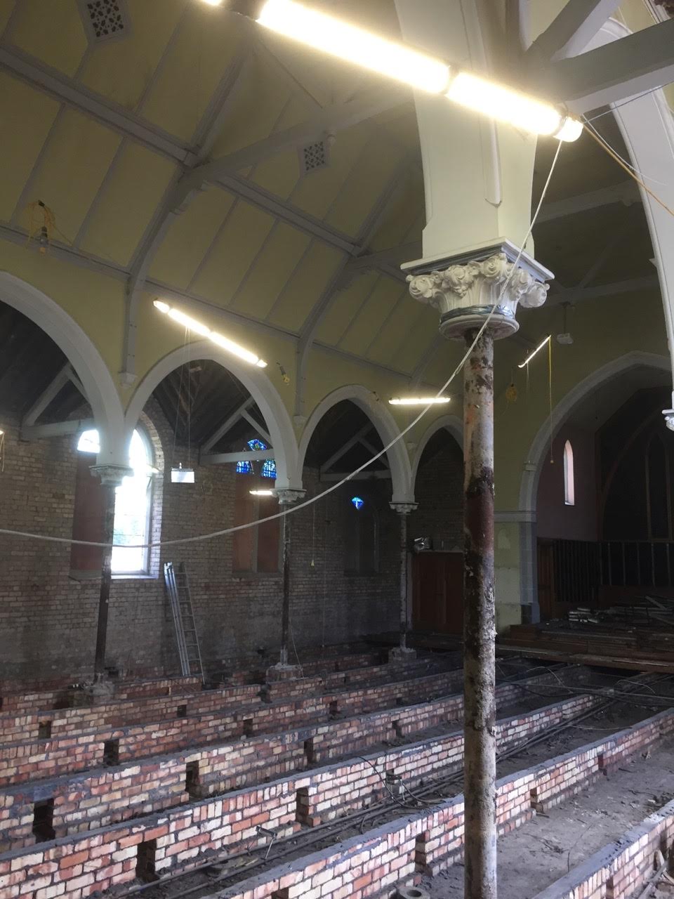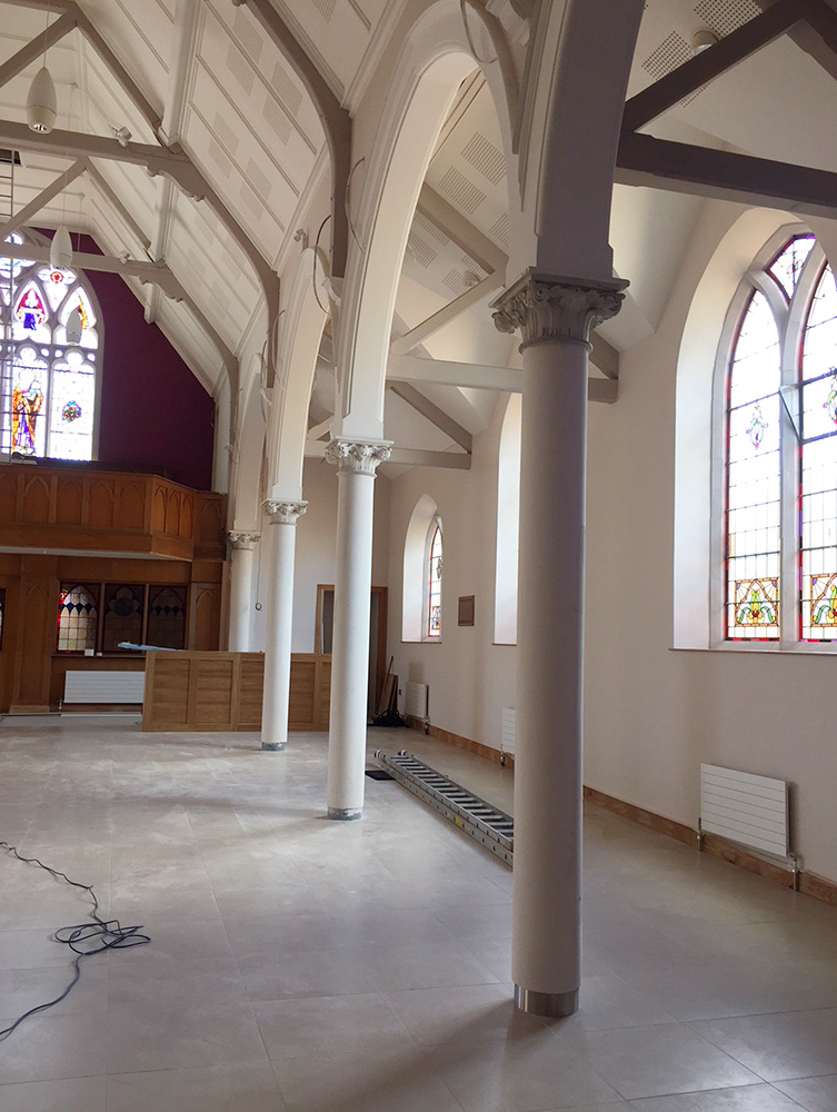 Work on the church building interior is going well. Now that the building has been sealed with the window glass in place in the Welcome Centre and the stained glass windows have been re-installed, including the Millennial Centennial Window, the builders have been able to install the underfloor heating, radiators and electric conduit. The scaffolding is now down to reveal the stunning brickwork. All very exciting now that we can see the end in sight!