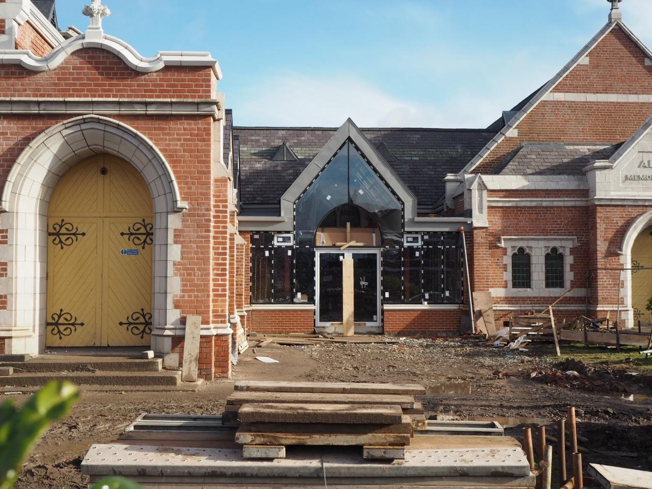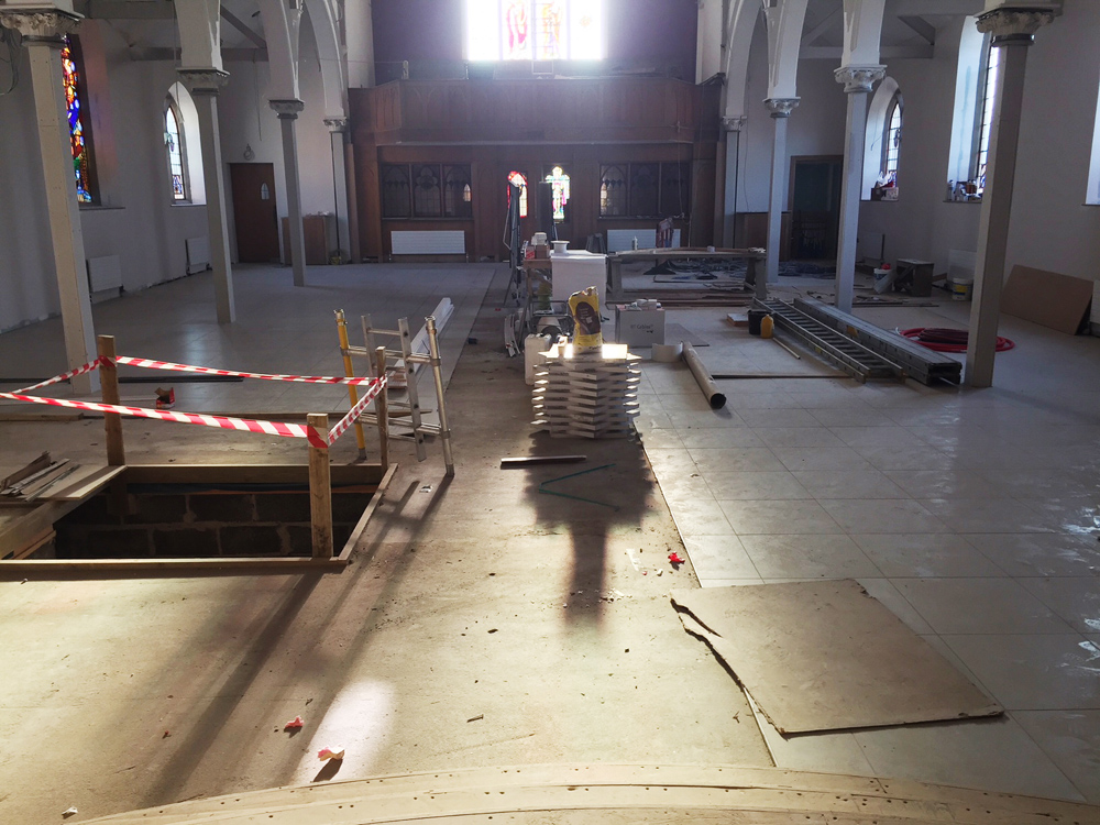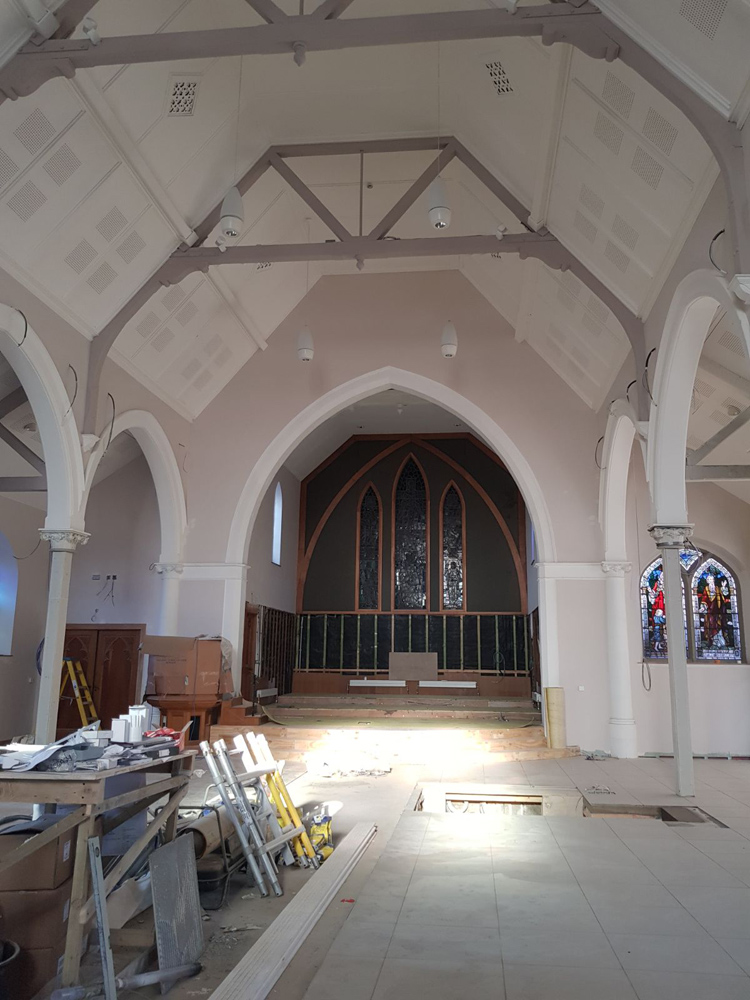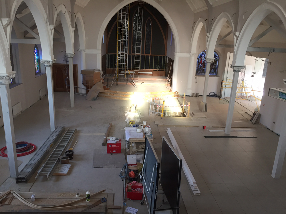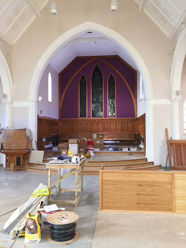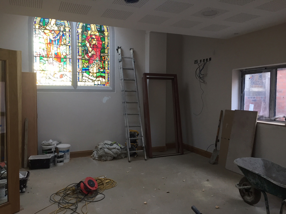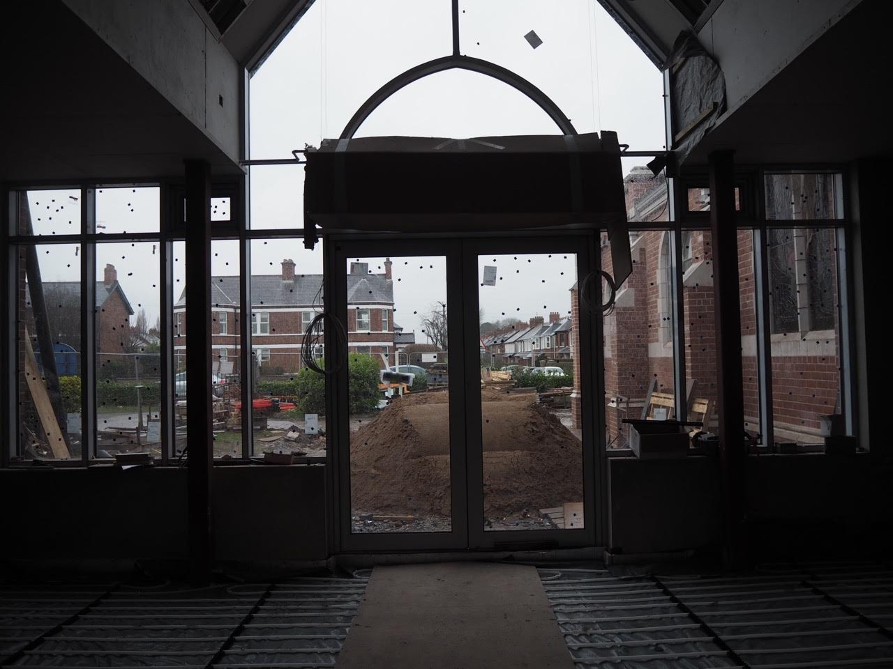 Work on the church building interior is going well. Now that the building has been sealed with the window glass in place in the Welcome Centre and the stained glass windows have been re-installed, including the Millennial Centennial Window, the builders have been able to install the underfloor heating, radiators and electric conduit. The scaffolding is now down to reveal the stunning brickwork. All very exciting now that we can see the end in sight!