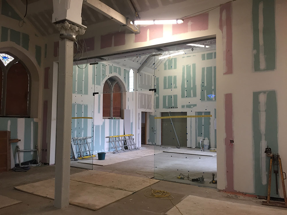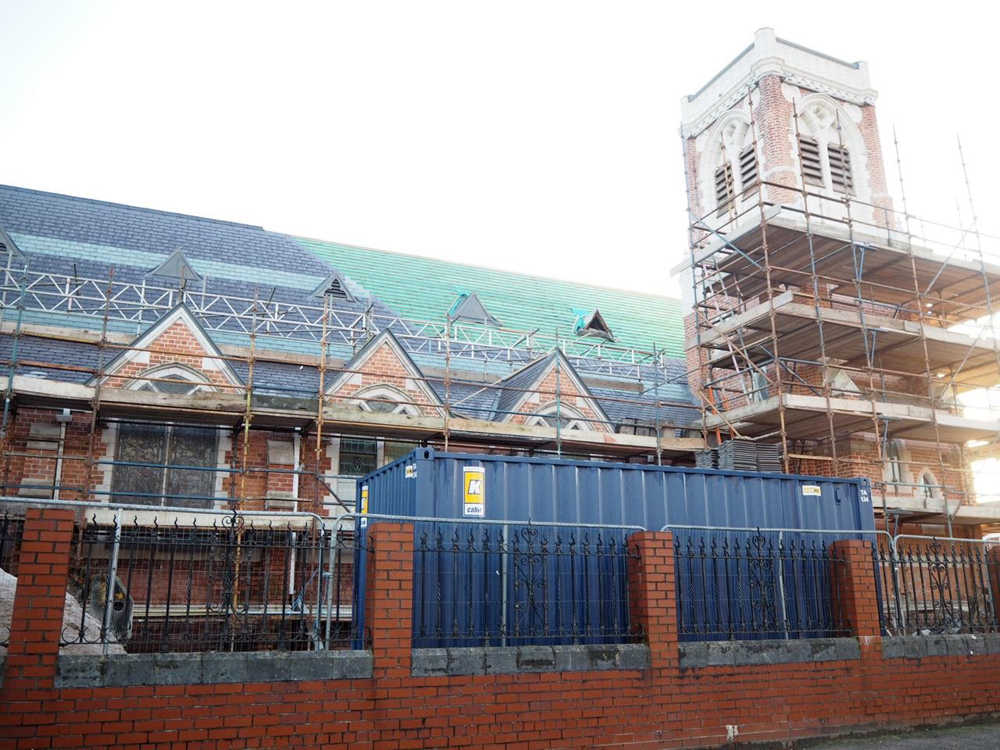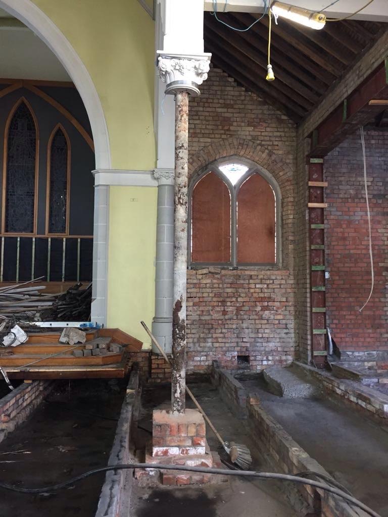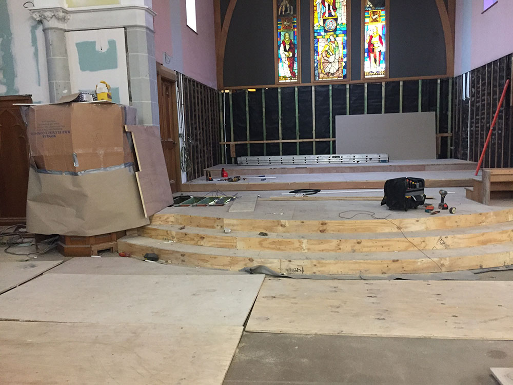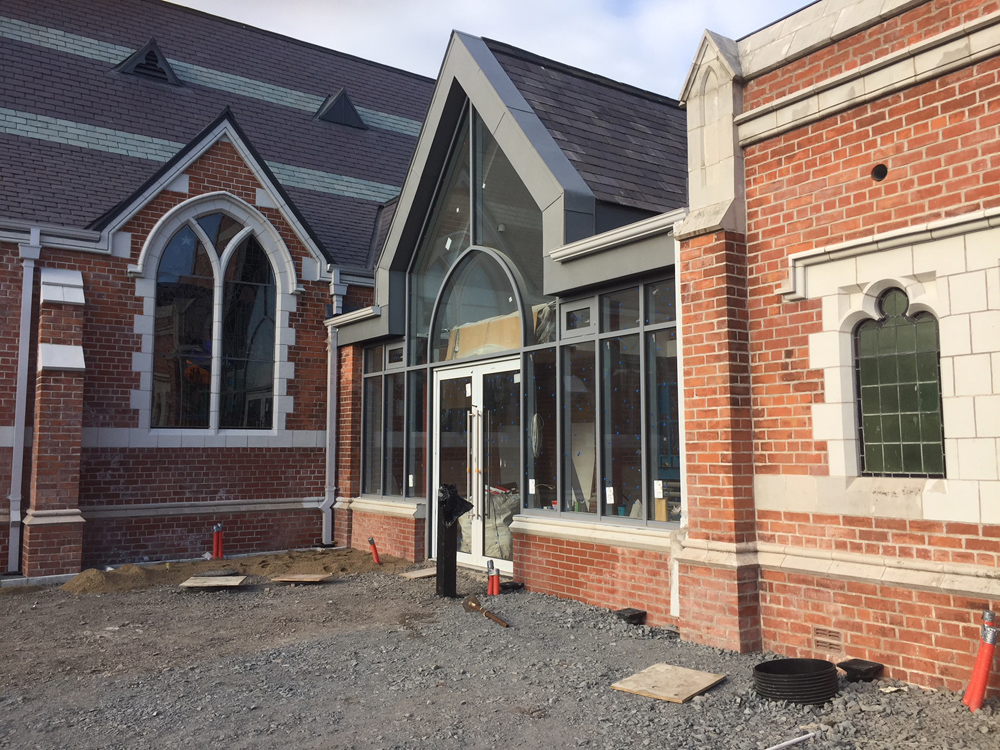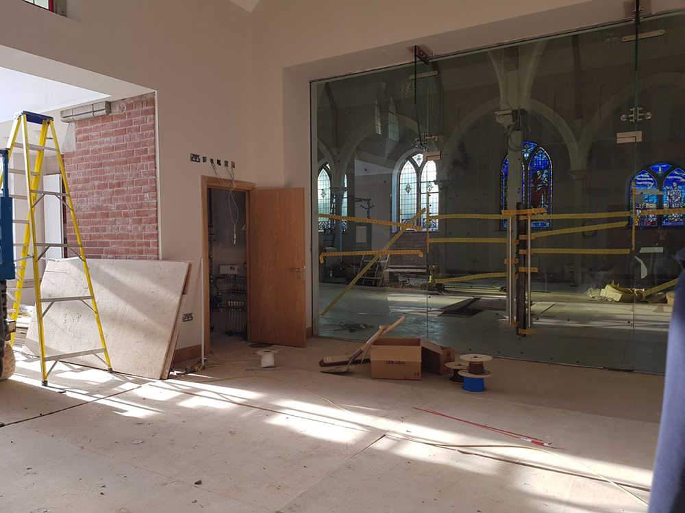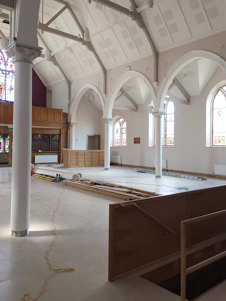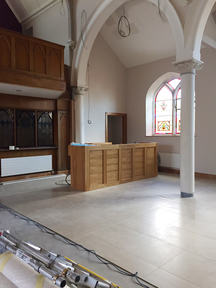 Work on the church building interior is going well. Now that the building has been sealed with the window glass in place in the Welcome Centre and the stained glass windows have been re-installed, including the Millennial Centennial Window, the builders have been able to install the underfloor heating, radiators and electric conduit. The scaffolding is now down to reveal the stunning brickwork. All very exciting now that we can see the end in sight!