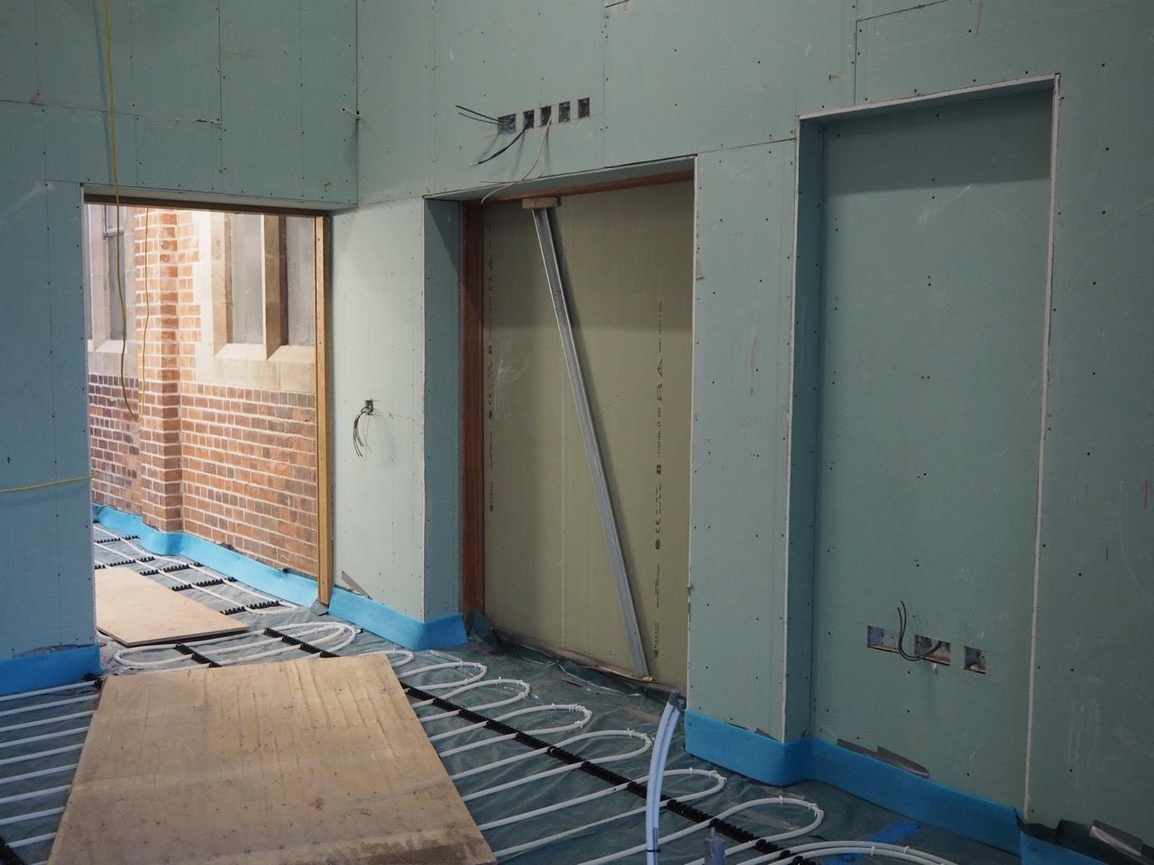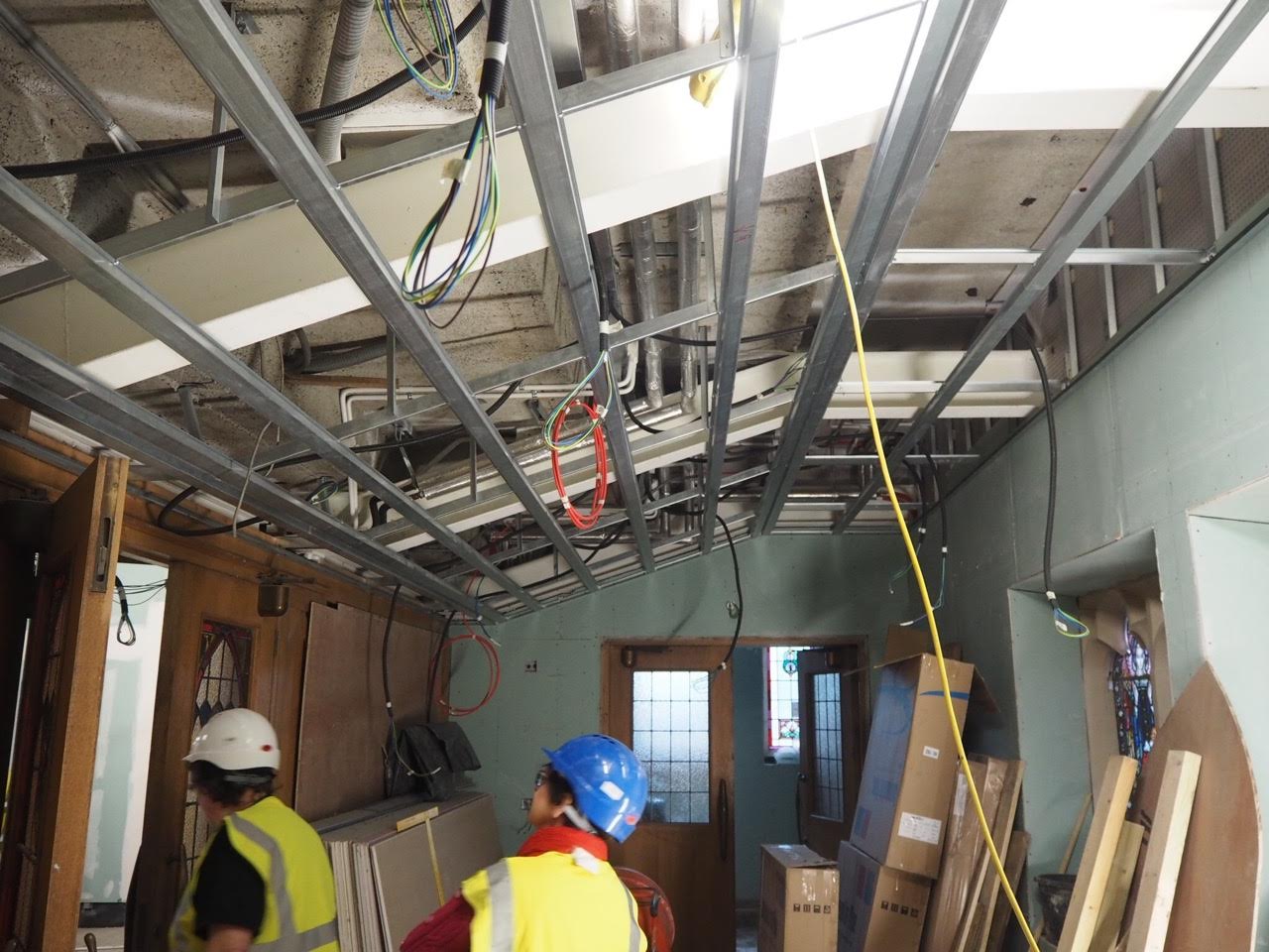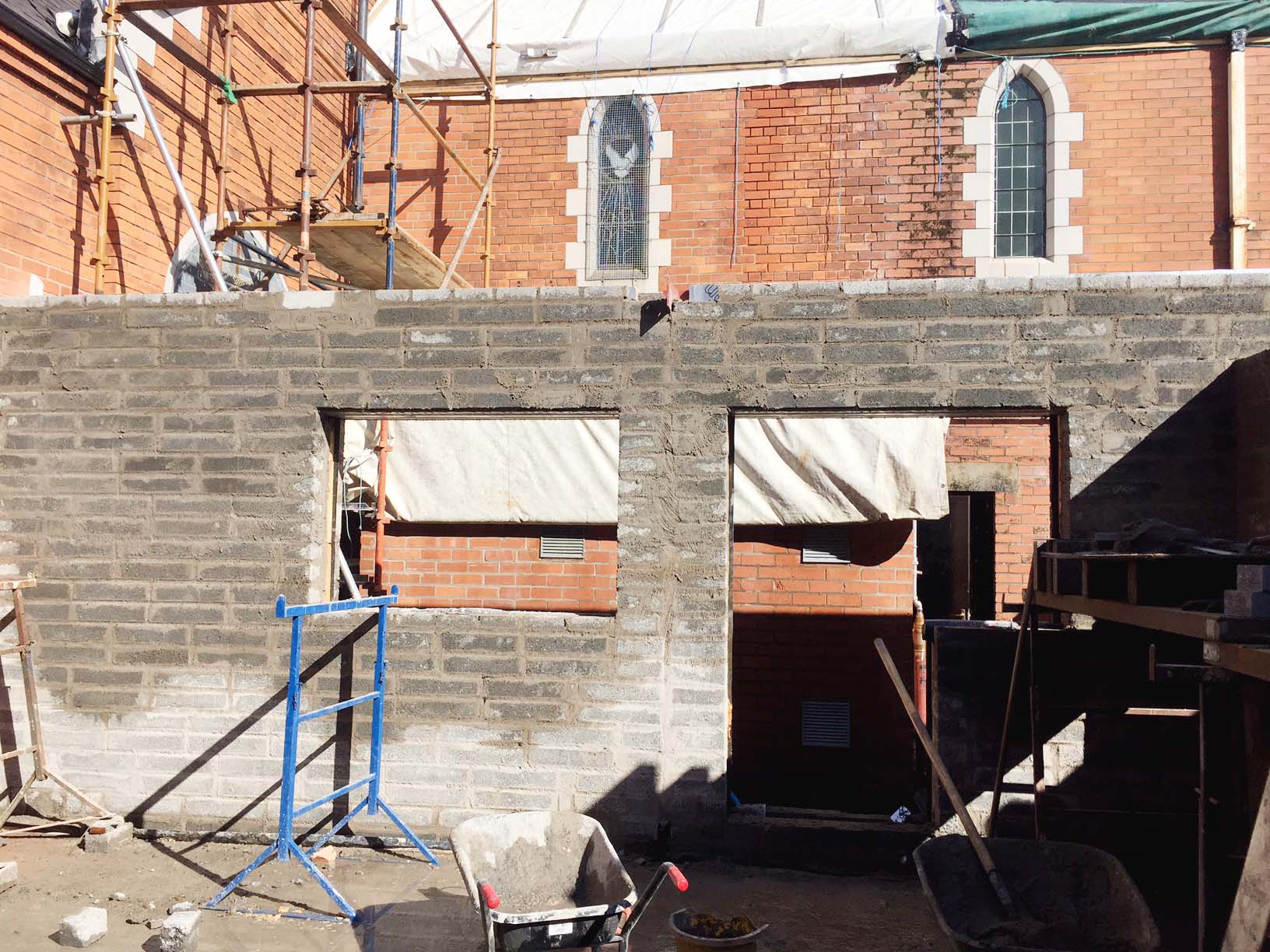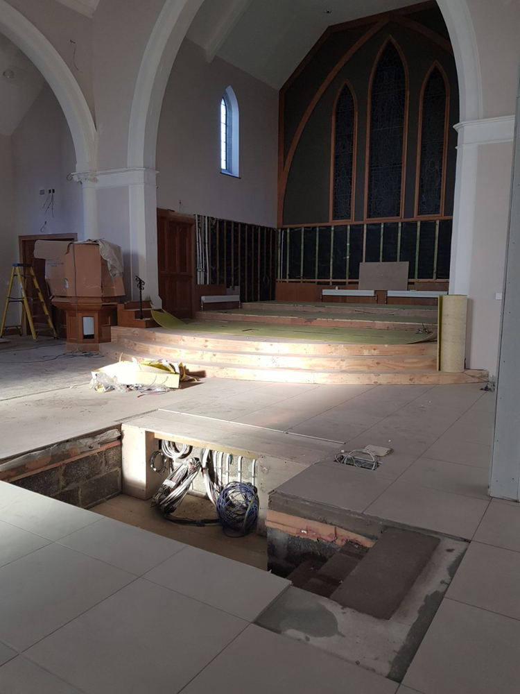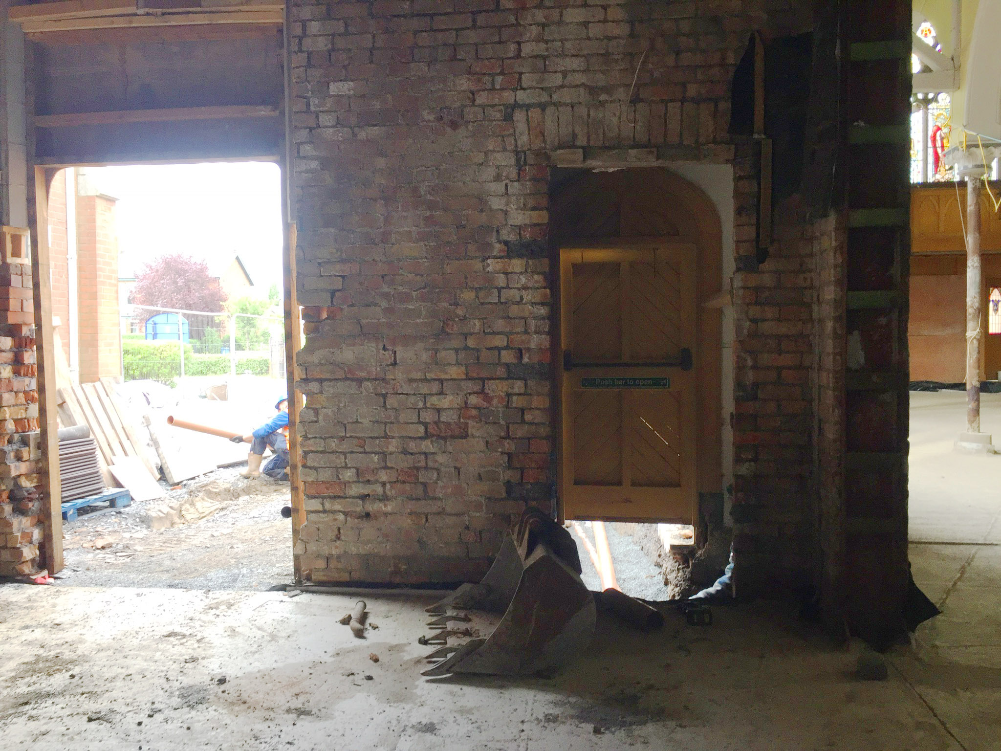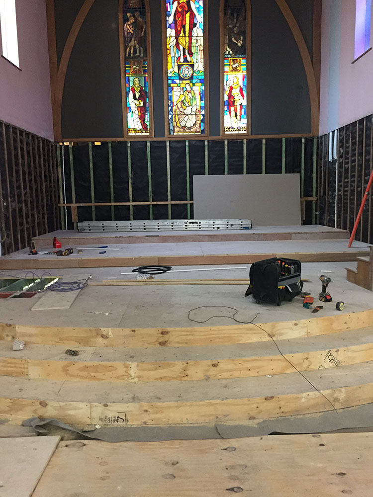 Work on the church building interior is going well. Now that the building has been sealed with the window glass in place in the Welcome Centre and the stained glass windows have been re-installed, including the Millennial Centennial Window, the builders have been able to install the underfloor heating, radiators and electric conduit. The scaffolding is now down to reveal the stunning brickwork. All very exciting now that we can see the end in sight!