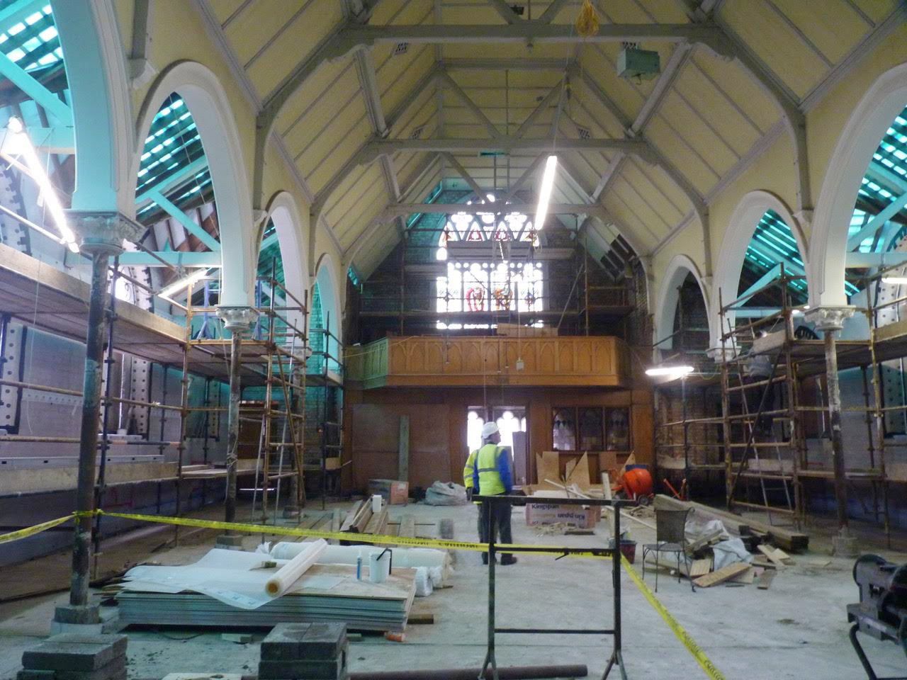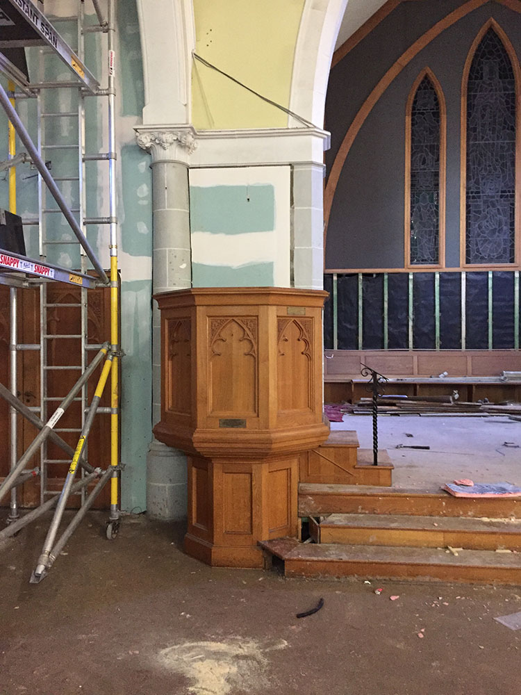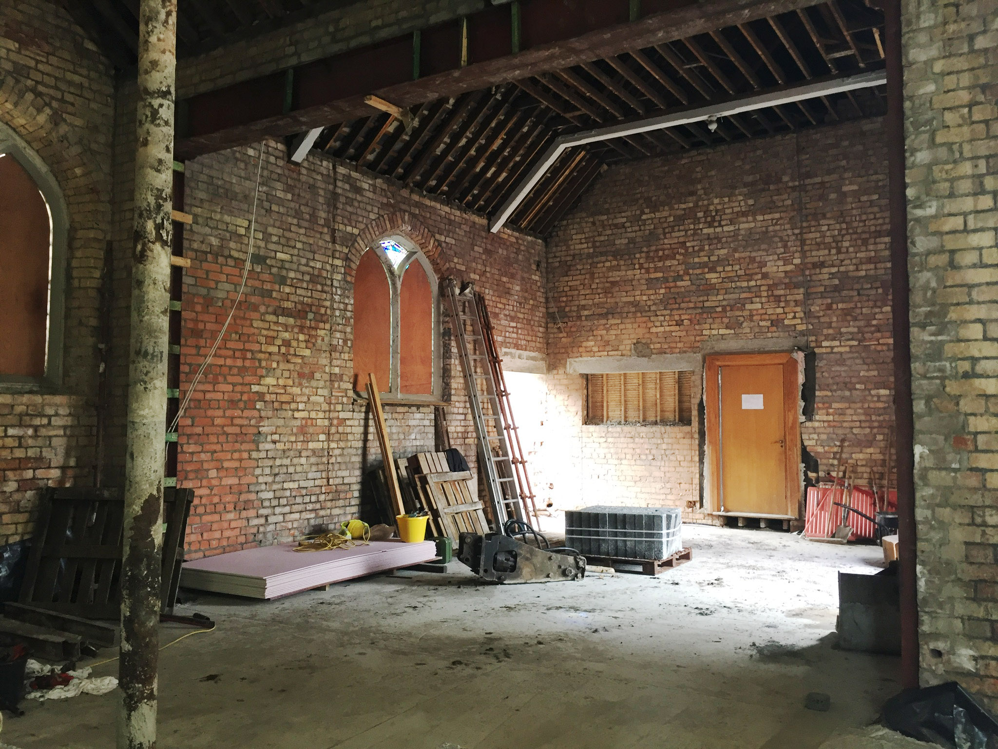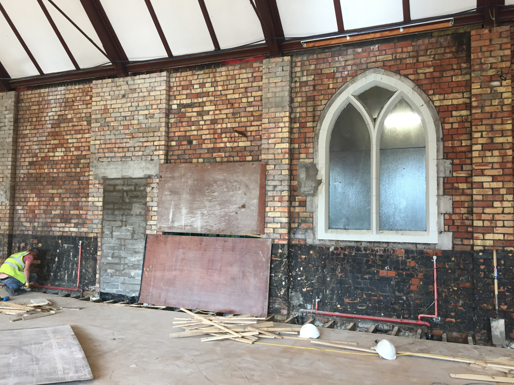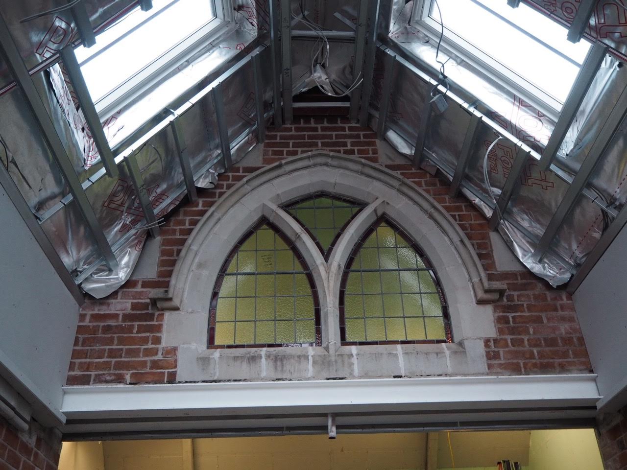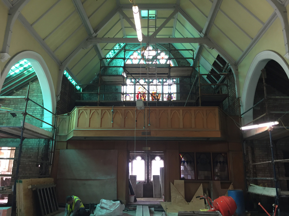 Work on the church building interior is going well. Now that the building has been sealed with the window glass in place in the Welcome Centre and the stained glass windows have been re-installed, including the Millennial Centennial Window, the builders have been able to install the underfloor heating, radiators and electric conduit. The scaffolding is now down to reveal the stunning brickwork. All very exciting now that we can see the end in sight!