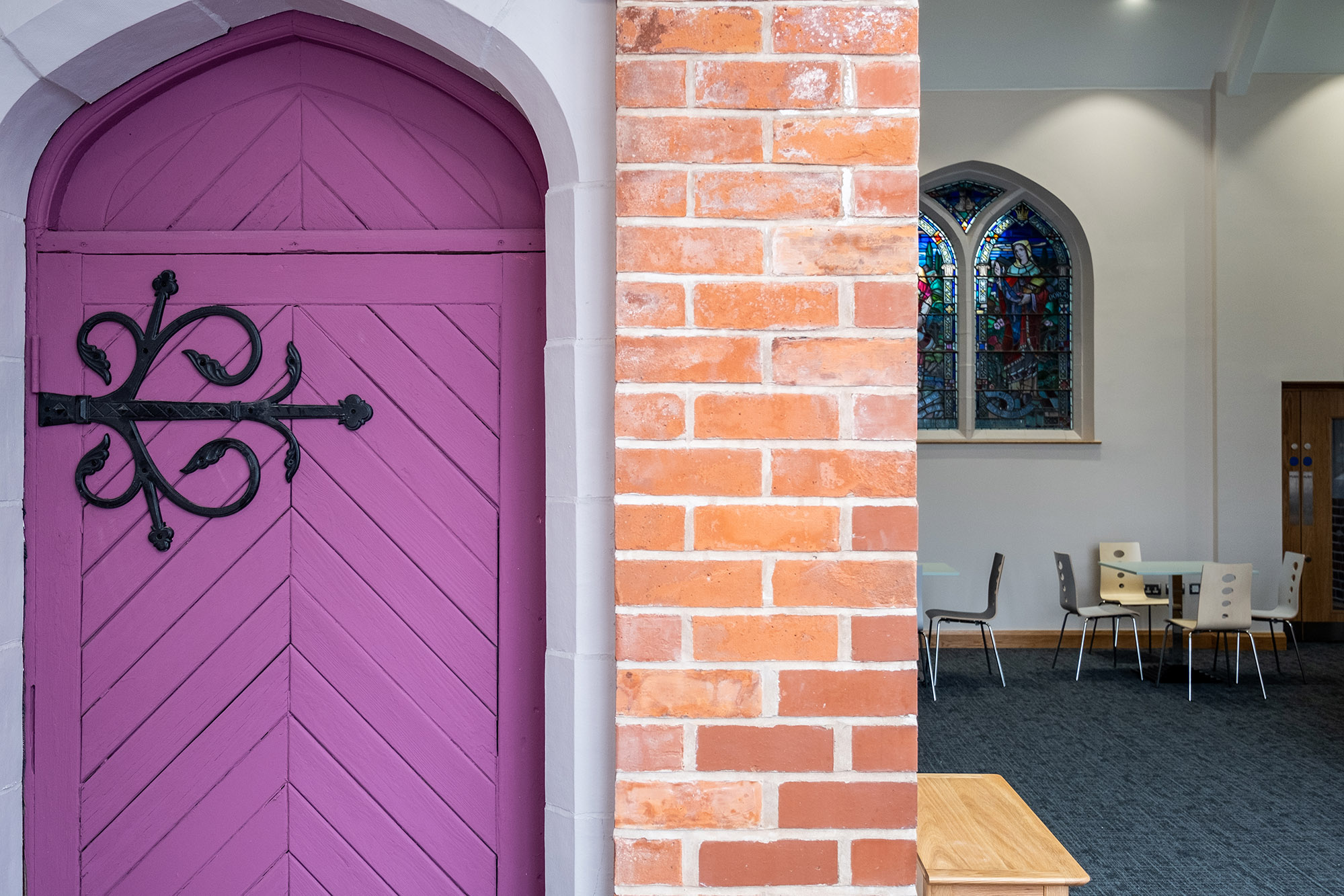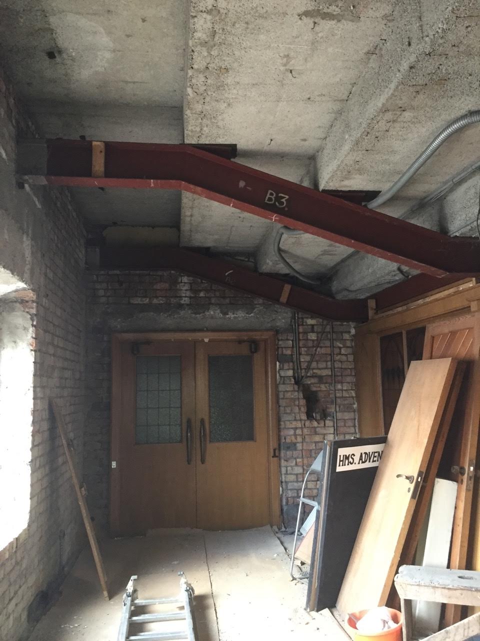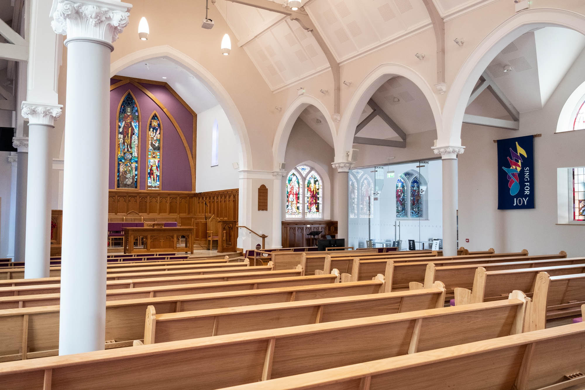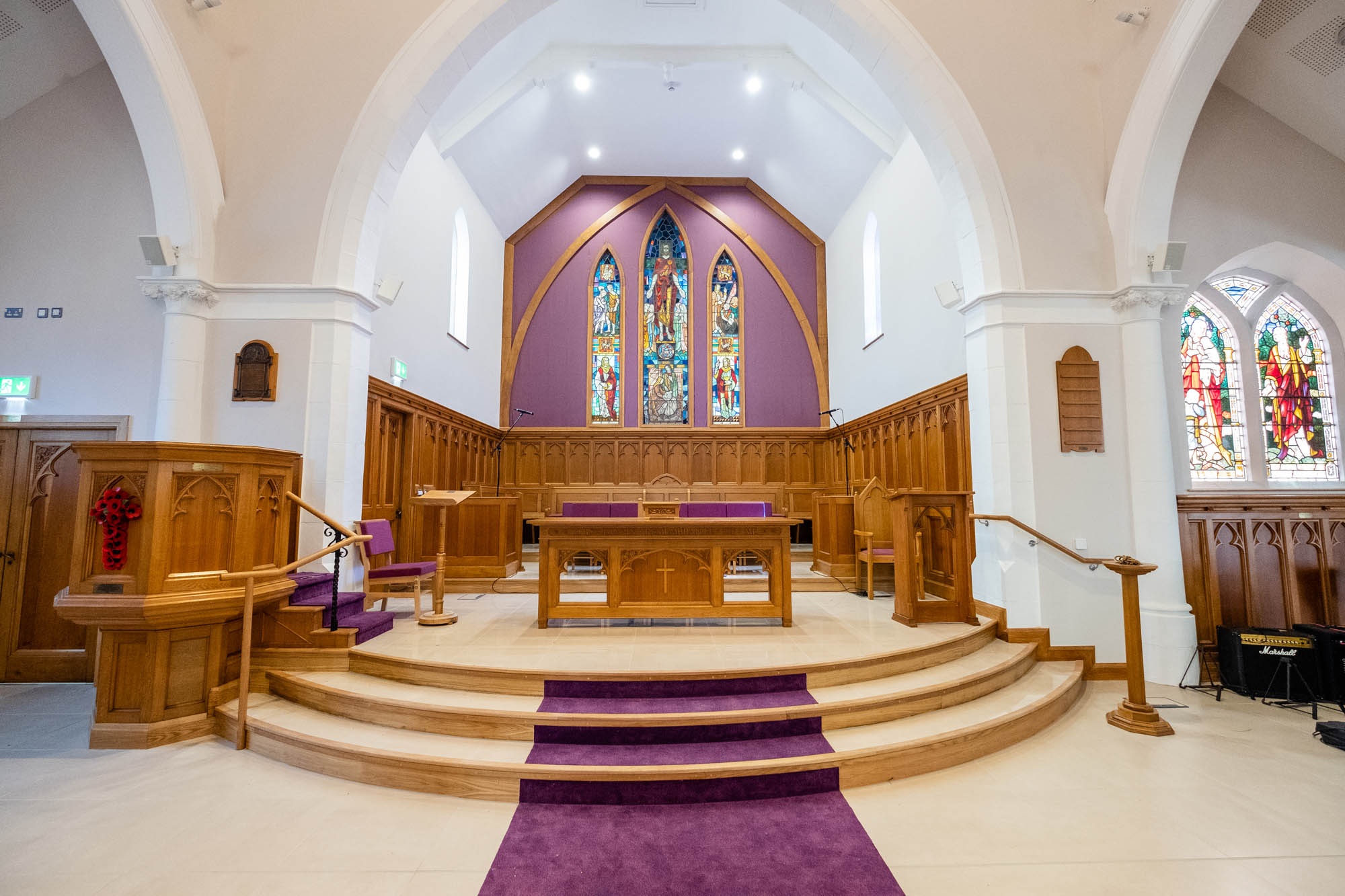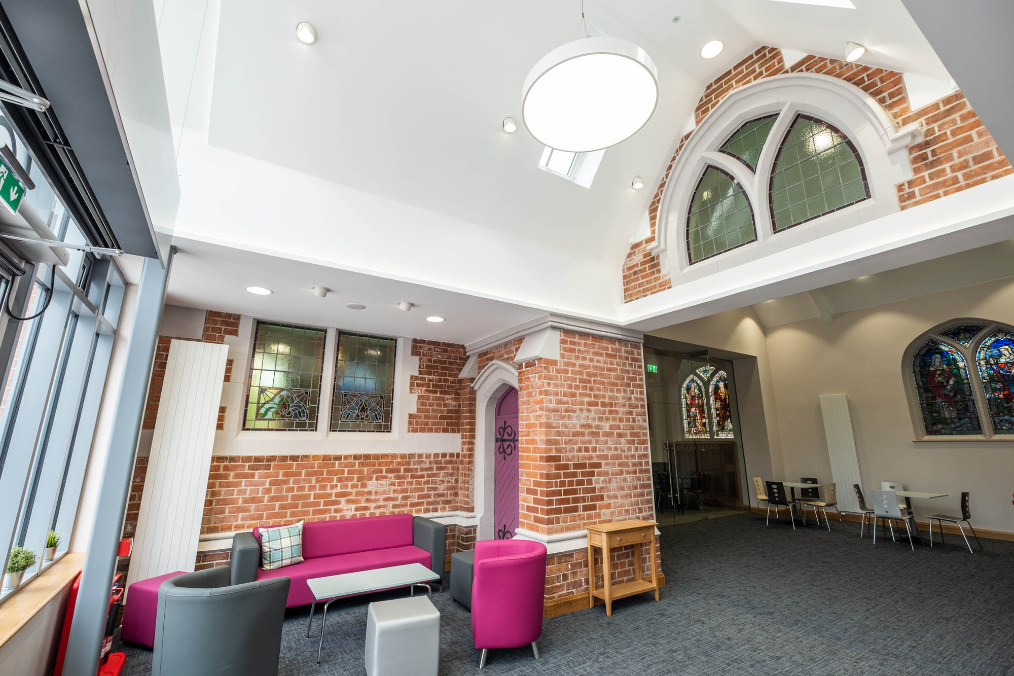 Work on the church building interior is going well. Now that the building has been sealed with the window glass in place in the Welcome Centre and the stained glass windows have been re-installed, including the Millennial Centennial Window, the builders have been able to install the underfloor heating, radiators and electric conduit. The scaffolding is now down to reveal the stunning brickwork. All very exciting now that we can see the end in sight!